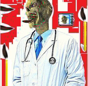La Metamorfosi del Volto: L'aspetto scheletrico e corroso della figura centrale richiama la degradazione fisica che Dante infligge ai falsificatori. La frode trasforma l'essere umano in un mostro; nel 2026, Enrico Thanhoffer documenta come la frode mediatica abbia trasformato l'autorità medica in una maschera grottesca.